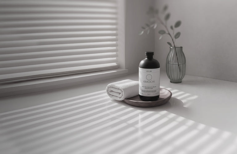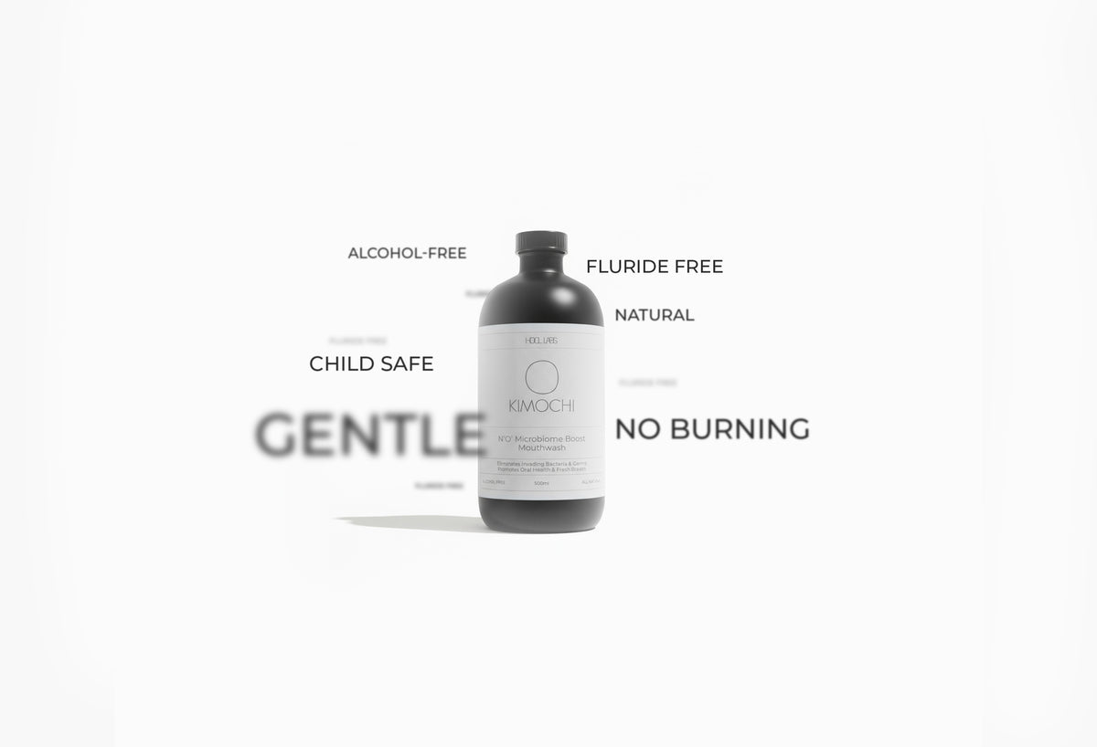 KIMOCHI is a gentle, alcohol-free mouthwash powered by hypochlorous acid (HOCl)—a molecule your body naturally makes. It targets harmful bacteria and biofilm while respecting beneficial bacteria, so you get a clean mouth without the burn and without disrupting your oral microbiome.